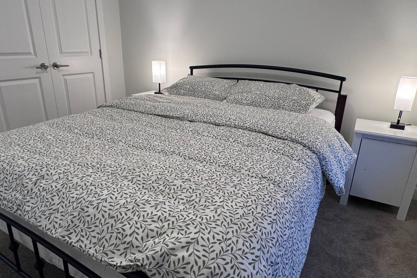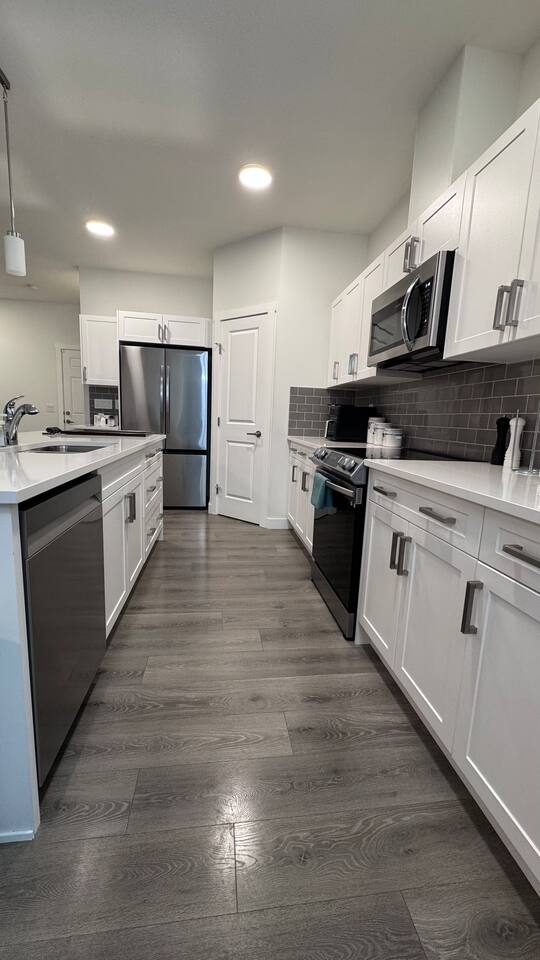 The spacious master bedroom features a brand-new king bed and mattress, nightstands, a walk-in closet, and a shared Jack-and-Jill bathroom. Bedrooms two and three are equipped with brand-new queen mattresses and nightstands. Extra pillows are available upon request for added comfort. The spacious master bedroom features a brand-new king bed and mattress, nightstands, a walk-in closet, and a shared Jack-and-Jill bathroom. Bedrooms two and three are equipped with brand-new queen mattresses and nightstands. Extra pillows are available upon request. The kitchen is fully equipped with ample pots and pans, an air fryer, toaster, microwave, oven, and a 4-burner cooktop—perfect for everyday cooking or extended stays.